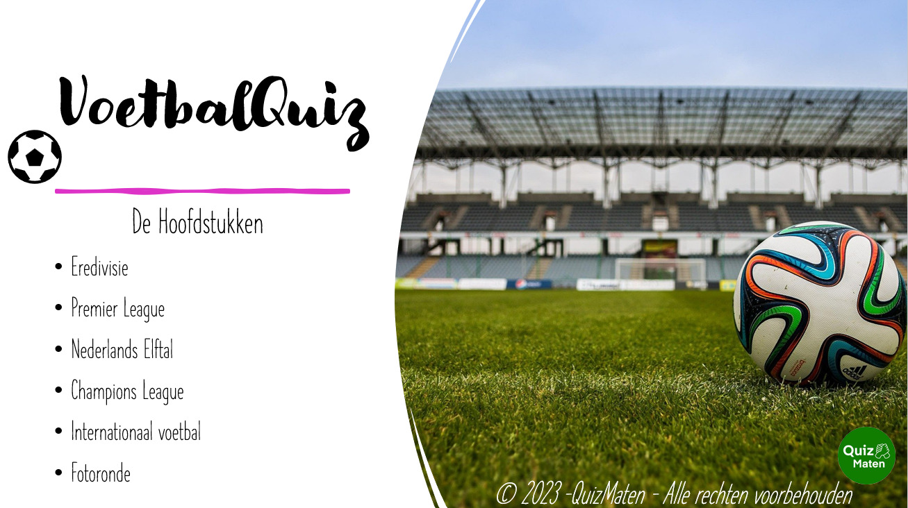 Ben jij iemand die graag voetbalt en/of veel van het kijken naar voetbal houdt? Ben jij een 茅chte voetballiefhebber en denk je dat je veel over voetbal en voetballers weet? In deze VoetbalQuiz wordt jouw kennis over het voetbal getest. Organiseer een gezellige activiteit met je voetbalmaten en kijk wie zich de beste voetbalkenner mag noemen. We wensen je alvast een gezellige en sportieve Quiz toe!